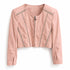 Patrizia Pepe, giacca in eco-pelle rosa, con dettagli in metallo argentato davanti e dietro.