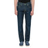 Tramarossa jeans blu di alta sartoria in cotone leggermente elasticizzato con dettagli cuciture verdi e bottone verde lucido, vestibilità regular, modello a cinque tasche, patch in pelle scamosciata verde brillante con logo metallico sul retro